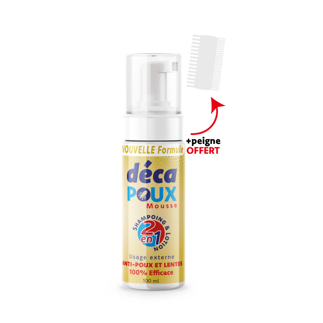 décaPOUX est une mousse traitante lavante, antipoux et anti-lentes. décaPOUX est 2 en 1 : shampooing et lotion. décaPOUX est à base de diméthicone, enrichie en provitamine B5 et en Aloe vera. décaPOUX élimine 100 % les poux et les lentes et agit en 15 minutes seulement. décaPOUX convient aux adultes et aux enfants à partir de 6 mois.